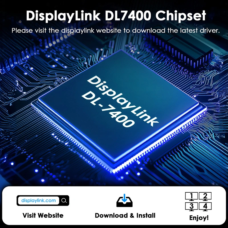 • 【DisplayLink DL7400 Chipset】 Powered by the latest DisplayLink DL7400 chipset, this universal display adapter ensures smooth and reliable performance, delivering high-quality video output across multiple displays. Especially customized for light office environments where tasks such as document editing, web browsing, and video conferencing are common.