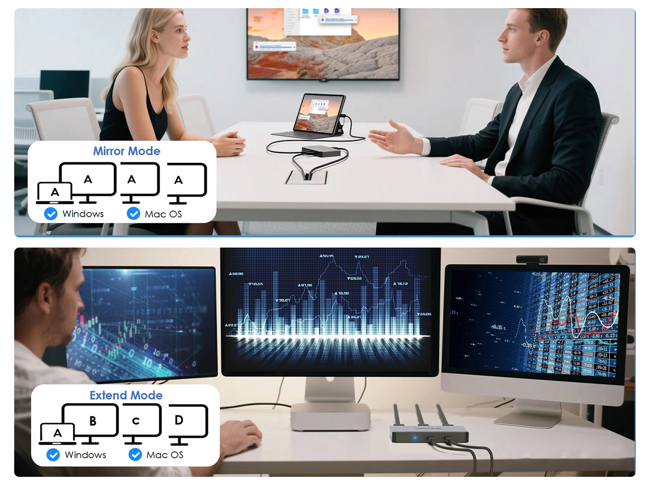 Both Windows and Mac support Mirror Mode and Extend Mode; Especially suitable for MacBook users, allowing them run different apps, windows, and workflows across multiple screens simultaneously.