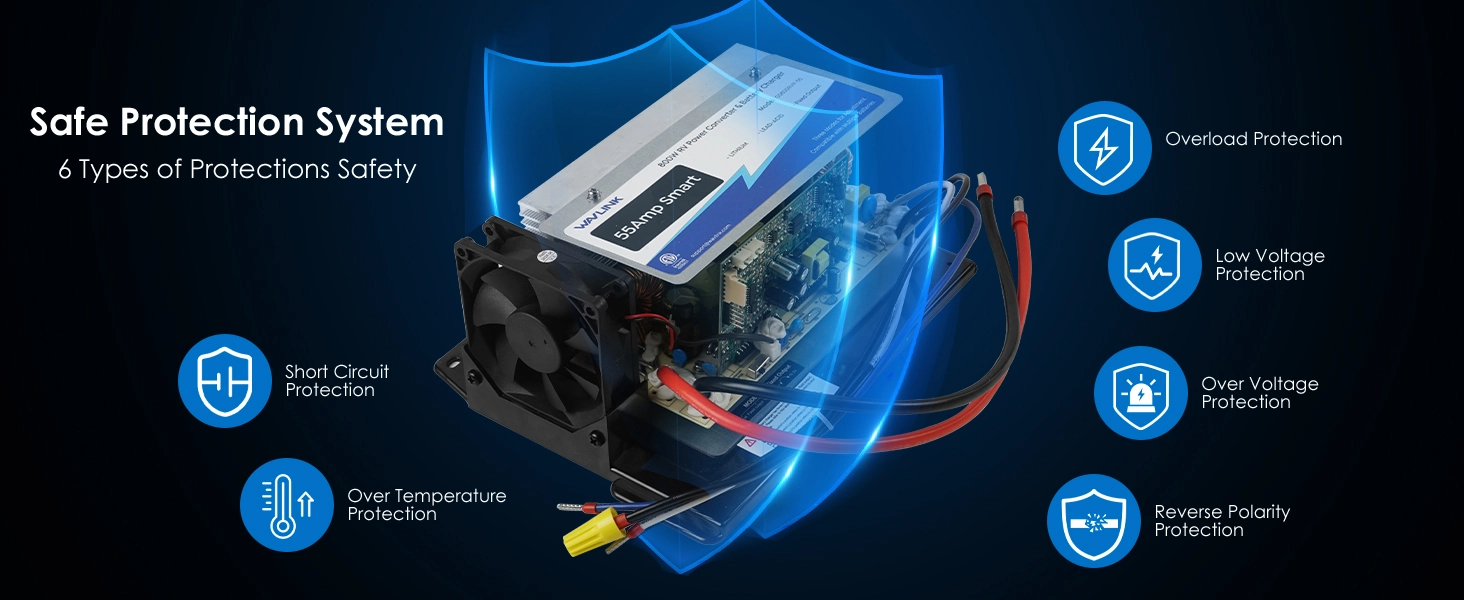 [Comprehensive Safety Measures] Our RV power converter prioritizes your safety and equipment longevity. With multiple protections including short circuit, software over voltage protection, thermal protection, current limiting protection, and reverse polarity protection, your peace of mind is assured on every journey
