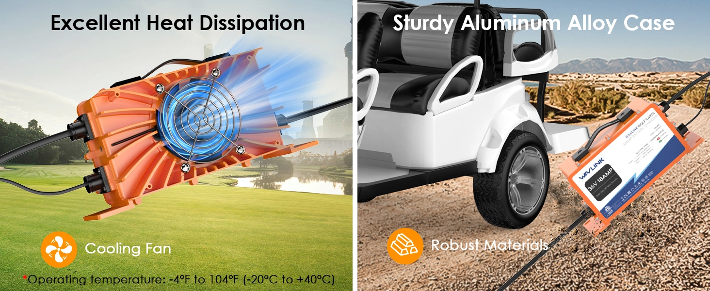 【Superior Safety & Protection】 Equipped with a cooling fan for excellent heat dissipation and key safety measures like short-circuit and overvoltage protection, ensuring secure charging. Its smart mode adjusts settings according to battery conditions to prevent overcharging or undercharging. The rubber charging cable surpasses PVC versions in abrasion and heat resistance, enhancing durability and waterproofing.