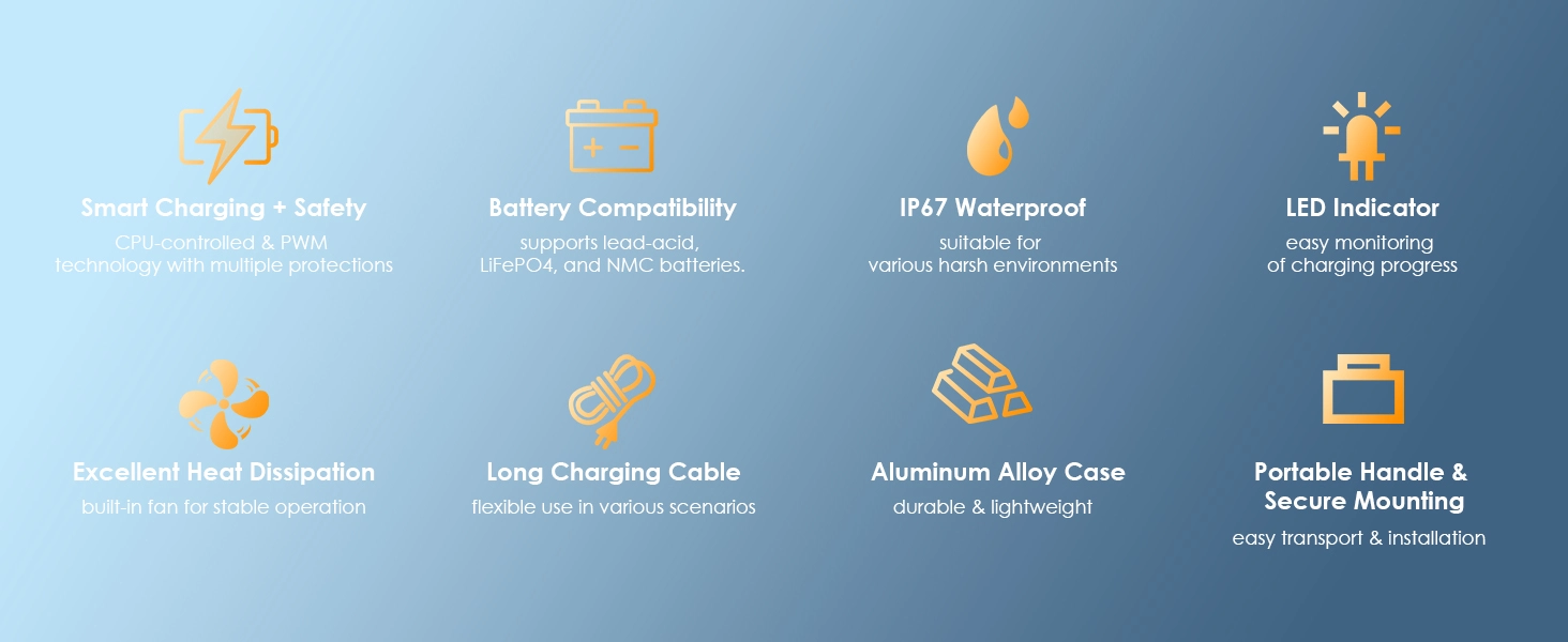 【Superior Safety & Protection】 Equipped with a cooling fan for excellent heat dissipation and key safety measures like short-circuit and overvoltage protection, ensuring secure charging. Its smart mode adjusts settings according to battery conditions to prevent overcharging or undercharging. The rubber charging cable surpasses PVC versions in abrasion and heat resistance, enhancing durability and waterproofing.